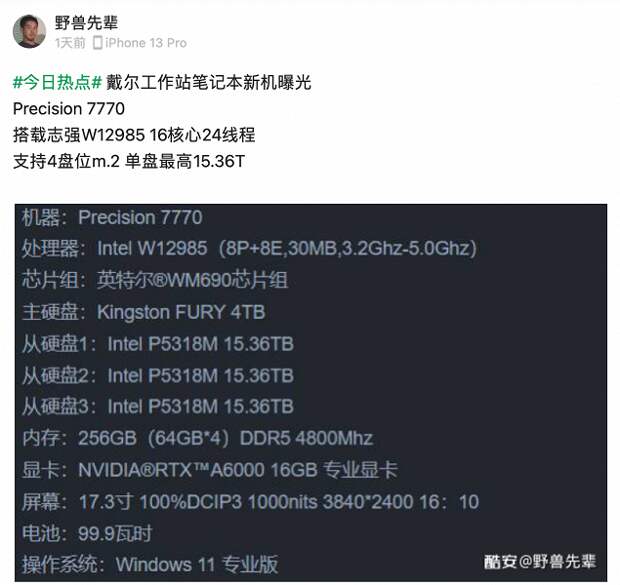 На данный момент самым мощным мобильным процессором Intel линейки Alder Lake является 14-ядернй и 20-поточный Core i9-12900HK, однако скоро у Intel появится CPU помощнее – W12985 уже засветился в конфигурации перспективной мобильной рабочей станции Dell Precision 7770.