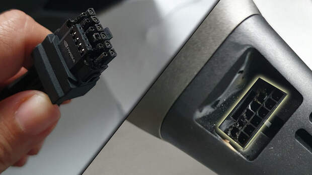 С этой ситуацией столкнулся главный редактор DSO Gaming Джон Пападопулос (John Papadopoulos), которого сложно заподозрить в том, что он не умеет правильно подключать кабель питания видеокарты. Однако, несмотря на то, что все было соединено правильно (Пападопулос использовал кабель 12V-2x6 из комплекта поставки видеокарты), через какое-то время после нагрузки он заметил дым, исходивший из разъема. На фото видно, что оплавился нижний ряд контактов. Но при этом после простой манипуляции, описанной выше, видеокарта продолжила работать.